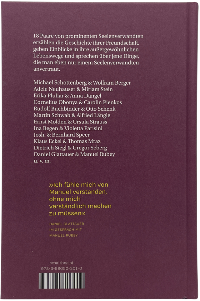 BUCH Amalthea Verlag, 2026 »Seelenverwandte« Prominente im Gespräch Das Gefühl von Seelenverwandtschaft kann ganz unvermittelt auftreten. Adele Neuhauser und Miriam Stein haben es am Set von »Vier Frauen und ein Todesfall« erlebt. Bei Rudolf Buchbinder und Otto Schenk war wiederum der Sinn für Humor die Basis ihrer jahrzehntelangen Freundschaft. Der Dichter und Liedermacher Ernst Molden würde in der Tierwelt den Zitronenfalter als Seelenverwandten bezeichnen, unter den »Menschenkindern« ist es die fünffache Romy-Preisträgerin Ursula Strauss.
